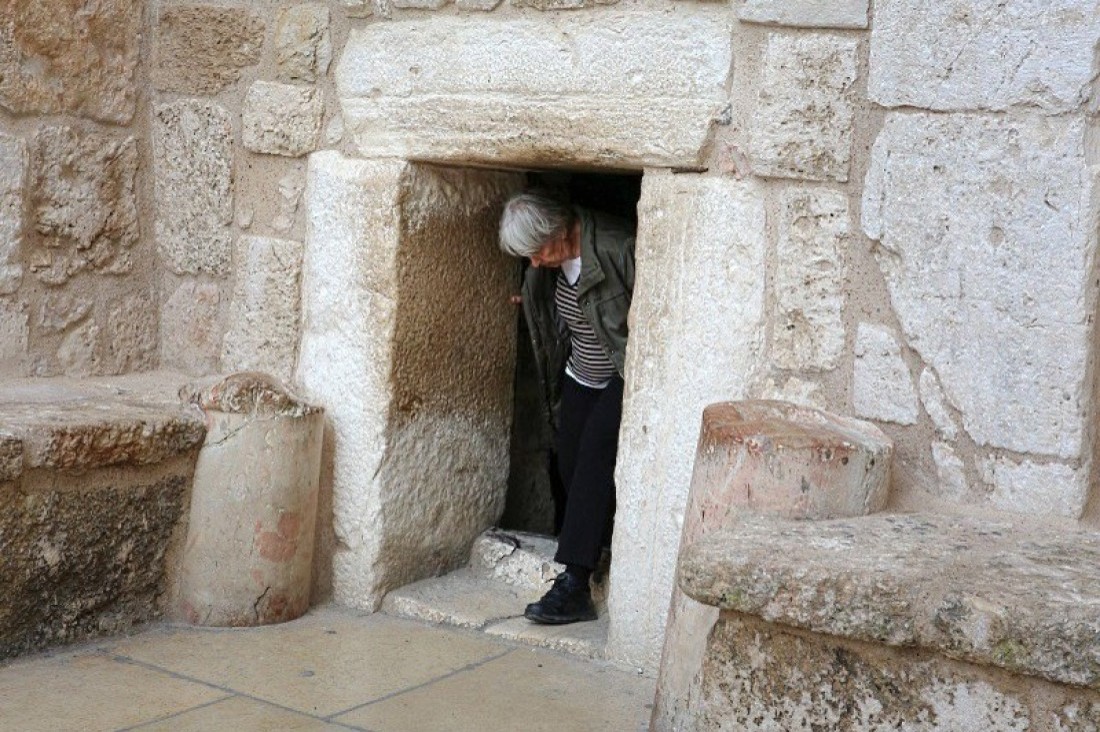 We wandelen naar de geboortekerk waar we stil worden gezet bij een café met kerststal en vrolijke jingle bell liedjes op de achtergrond. Het plein en de kerk zijn pijnlijk leeg vanwege de strijd en het gebrek aan geloof in Bethlehem. We naderen de kerk die bekend staat om het feit dat Christus daar geboren is. Wat opvalt is het kleine poortje als deuropening. Iedereen die naar binnen wil zal zich nederig moeten buigen. Bij het naar buiten gaan stoot ik mij hoofd en later peins ik daar nog even verder over…