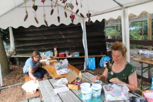 De ‘ateliertent’ is tijdens de tweede Reveilweek iets nieuws. Meta en Kri-Janda gaven vorig jaar een workshop die goed werd bezocht. Afgelopen jaar hebben we elkaar nog een aantal keren ontmoet en is deze plek ‘geboren’. Daarom hadden we op de eerste dag ter uitnodiging en kennismaking beschuit met muisjes moeten uitdelen.