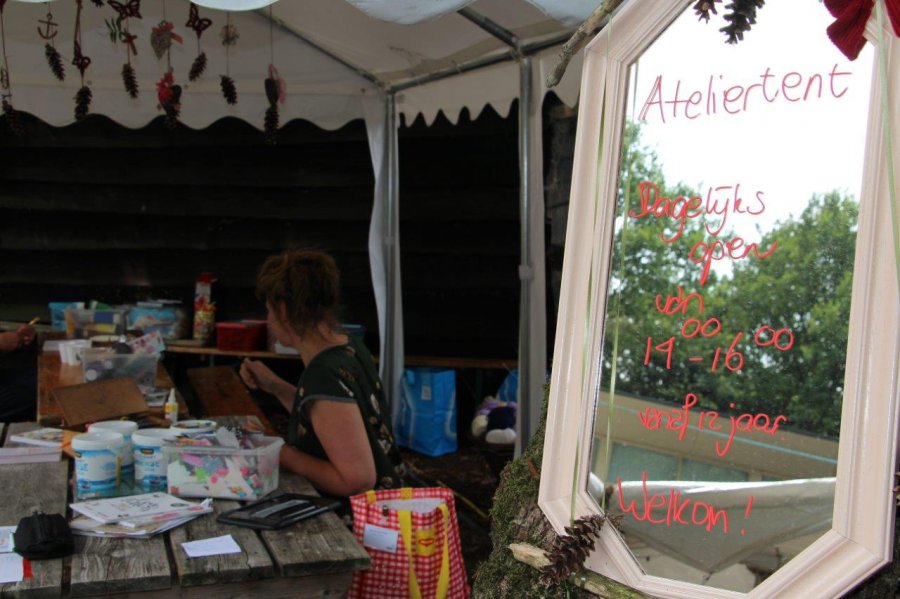 “Tegelijkertijd is de ateliertent een inspirerende plek. Voor sommige deelnemers is het de moeite waard om hun inspiratie creatief te verwerken. Vorig jaar hebben we deze tent bedacht en dit jaar heeft de NEM erin gefaciliteerd. Heel veel spullen hebben we gekregen van een andere creatieveling. Ik vind het echt fantastisch dat we hier staan.” Aldus een enthousiaste Meta.