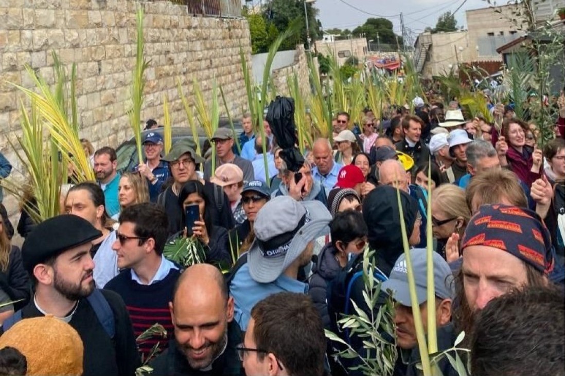 In allerlei talen wordt bovenstaande zin gezongen door een grote groep gelovigen, onderweg van Bethfage naar de Oude Stad van Jeruzalem. In optocht lopen we met palmtakken in de hand over de Olijfberg naar beneden. De Arabische jongetjes hebben er snel een handeltje van gemaakt. Ze bieden voor 10 shekel een palmtak te koop aan. Ik voel mij zo lopend een beetje beland in Lucas 20.